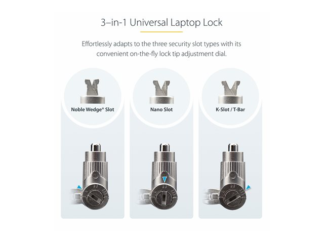 - VERROU 3 EN 1 POUR PC : Ce verrou conforme TAA est compatible avec les slots Noble Wedge , K-Slot (T-Bar) et Nano à l'aide d'un embout réglable; Câble épais de 2m résistant aux coupures; Le pack de 25 est idéal pour les administrateurs IT